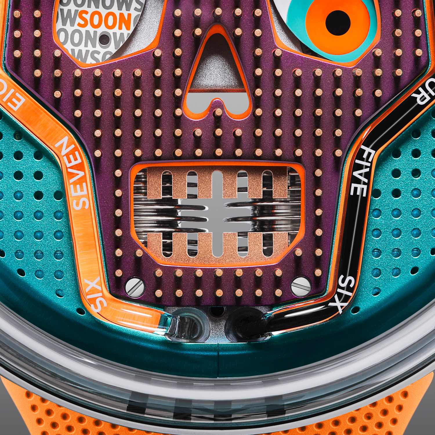 W przypadku tego producenta, nowe kolory to nie tylko odrobina farby lub barwnika. Tarcza edycji Drop Three jest tytanowa, a barwę zyskała w procesie anodyzowania. Turkus jest płótnem, na które naniesiono burgundową czaszkę. Ta z kolei jest otoczona kapilarą z czarnym i przejrzystym płynem, która "unosi się" nad trasą wytyczoną za pomocą pomarańczowej substancji Super-LumiNova.