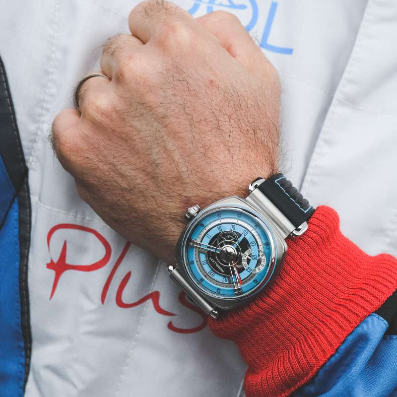 Poruszająca się klasycznie wskazówka minutowa ma prosty kształt, kojarzący się raczej z instrumentami widocznymi nad kierownicą, niż fantazyjnymi fasonami widocznymi zwykle ponad tarczami zegarków. Liternictwo wybrane do oznaczenia godzin i minut także czerpie z motoryzacji.