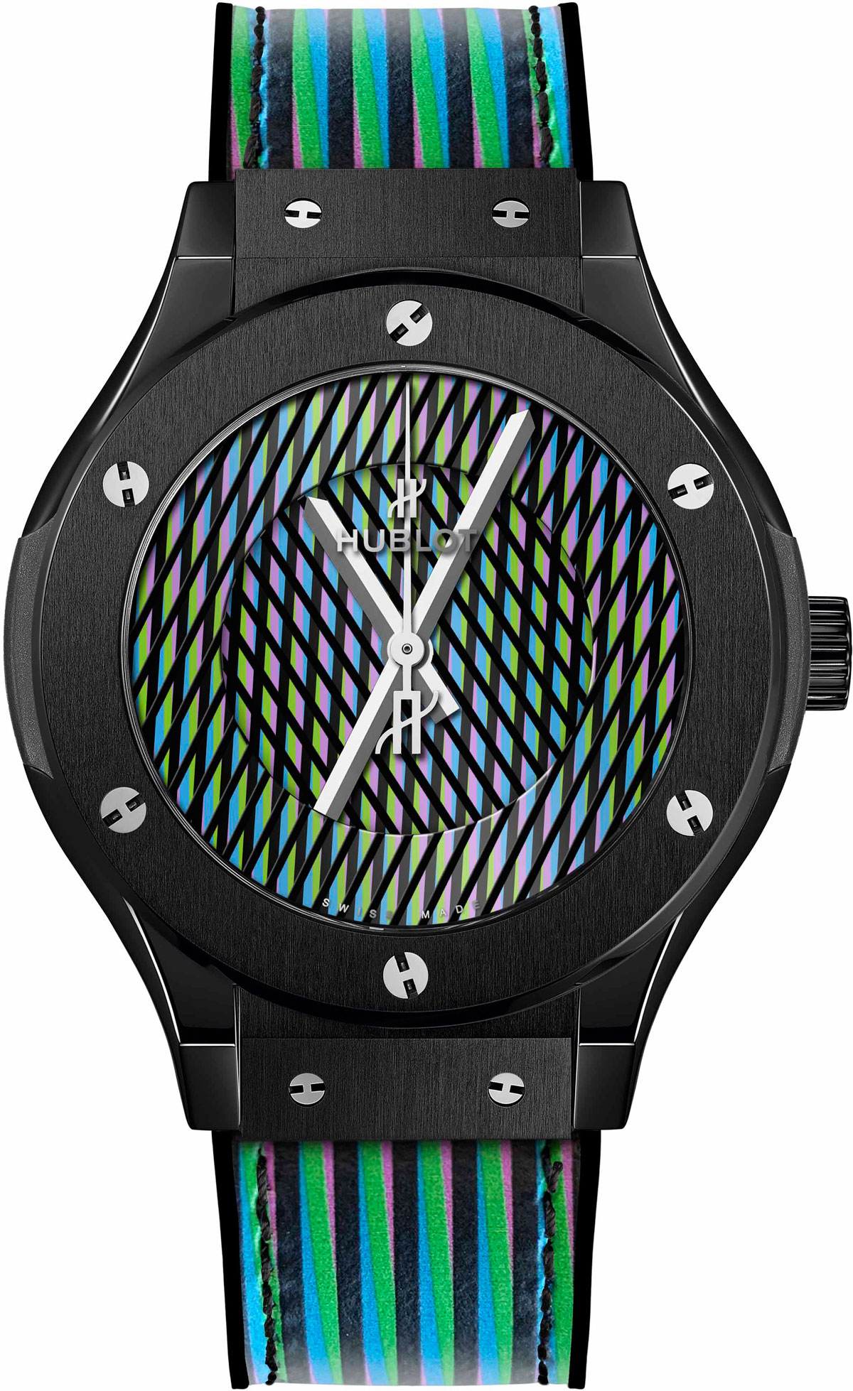 Artysta po wnikliwych analizach doszedł do wniosków, że "kolor reprezentuje efemeryczną, autonomiczną i wiecznie ewoluującą rzeczywistość". Ta myśl stała się motywem przewodnim najnowszej serii zegarków Hublot. Zaprojektowano je tak, że każdy pod szkłem ma dwa obrotowe dyski, jeden "unoszący" wskazówkę godzinową, drugi minutową. Na dyskach naniesiono czarne linie i liczne pasy zieleni, fioletu i błękitu. W ten sposób nowe zegarki Hublot, przy całej swojej "zegarkowatości" stają się nieustannie zmieniającymi się obiektami sztuki. Niezależnie jaki układ kolorów, linii w danej chwili będzie widoczny, nadal będzie możliwe sprawdzenie która jest godzina mimo braku indeksów i skal. Srebrzyste lub złote wskazówki są doskonale widoczne. Inspiracji zaczerpnięto z dzieła pod tytułem Chromointerférence, stworzonego w 1964 roku.